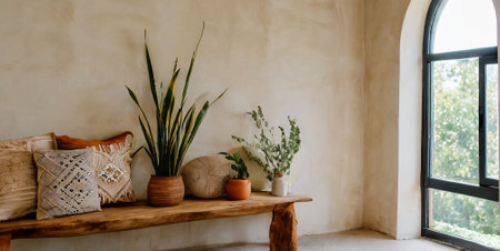 Interior of a living room with a wooden bench, plants and a window