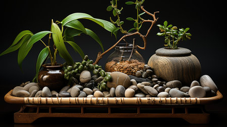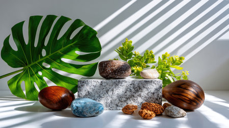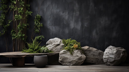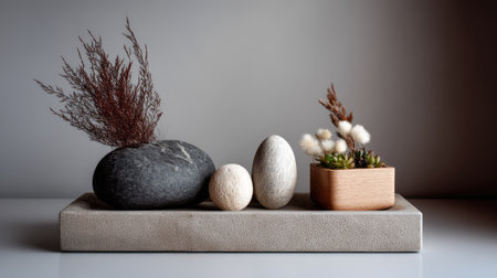 Zen-inspired podium with pebble and stone arrangement, peaceful and minimalist style
