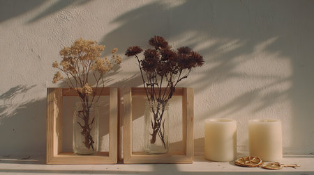 Display of dried flowers in glass vases placed inside wooden frames, alongside two pillar candles on a light-colored shelf. Soft, warm light casts gentle shadows on the wall behind the objects.