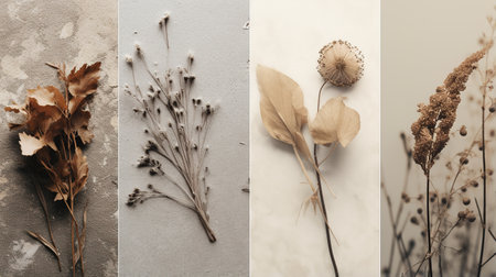 Discover a stunning display of minimalist decor featuring textured vases with dried flowers and artistic wooden elements, ideal for enhancing modern interiors.