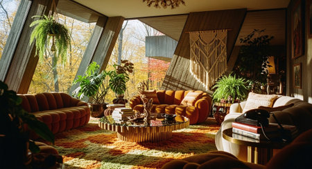A cozy living room with modern decor, featuring large windows showcasing autumn foliage, stylish furniture, and decorative plants