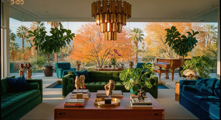 A stylish modern living room with green velvet sofas, a wooden coffee table adorned with sculptures, and large windows showcasing a vibrant autumn landscape with trees and a piano in the background