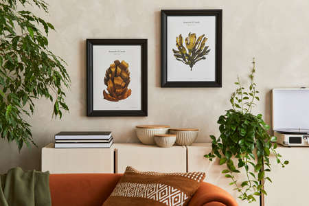 Creative interior composition of living room with mock up poster frames, designed couch, beige commode, plants and personal accessoriers. Template.