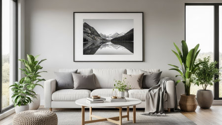 Interior of living room with mock up poster frame, plants, sea view and accessories. 3d render