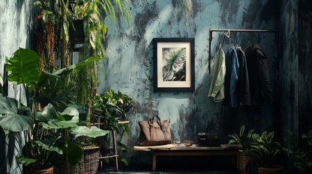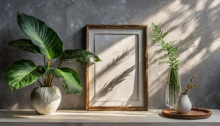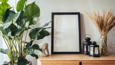 Photo frame mockup in modern interior with photo camera and plants.