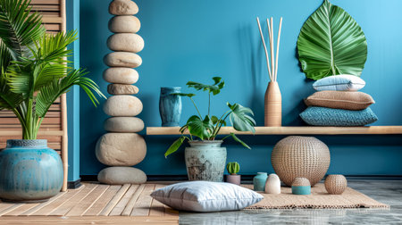Serene zen interiors composition with minimal furniture and vibrant contrast. Modern interior design composition