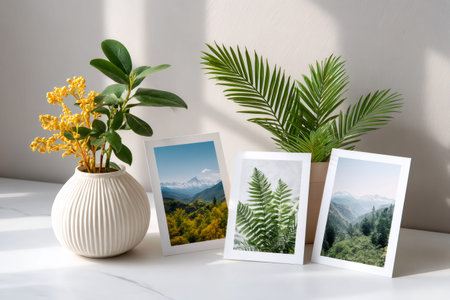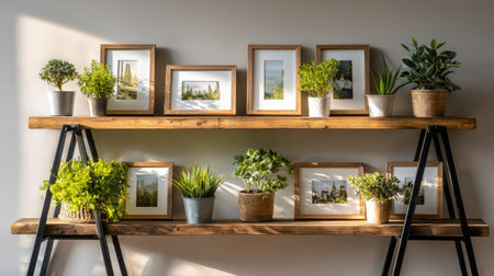 A stylish wooden shelf showcases various potted plants and framed photographs, bringing warmth and freshness to an indoor space with natural light.