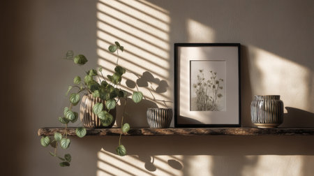 A wooden shelf displays framed art, plants, and ceramic objects against a neutral wall, bathed in sunlight.