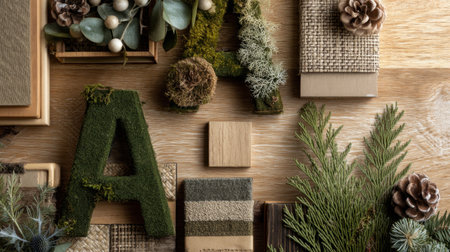This artistic arrangement features natural letters formed from moss and wood, combined with pinecones and fabrics, ideal for rustic decor ideas.