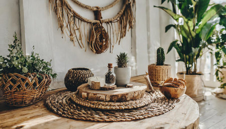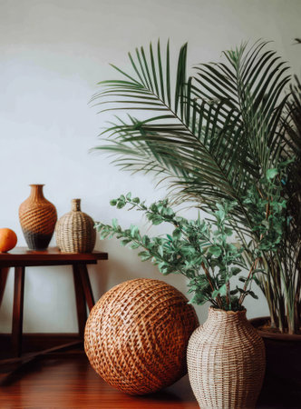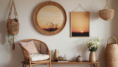 Woven decor and plants create a cozy corner in a home setting.