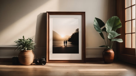 AI Generated. mockup of an empty picture frame standing on a side table