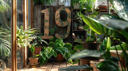 Wooden number 19 surrounded by greenery in a plant-filled sunroom