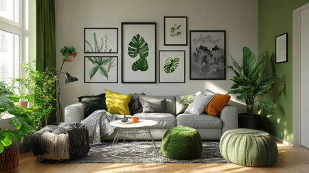 This image features a cozy living room adorned with green accents and modern artwork, complemented by lush indoor plants that create a serene atmosphere. The space is perfect for relaxation and home gatherings.