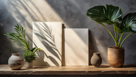 A serene interior scene showcases a wooden shelf adorned with elegant vases and botanical artwork. Soft light creates delightful shadows, enhancing the ambiance.