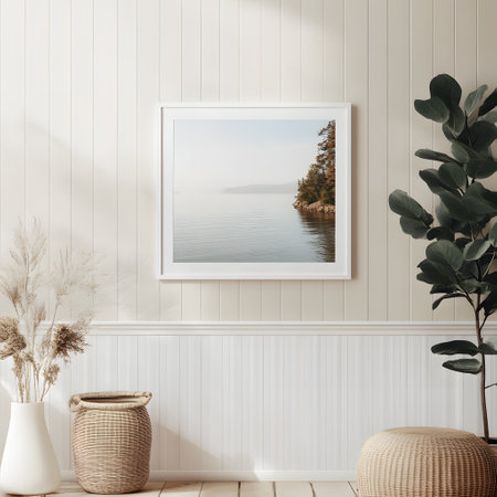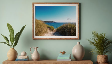 Coastal landscape art gallery wall with elegant framed seascapes and floral arrangement. That the image is generated using AI.