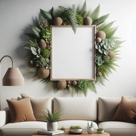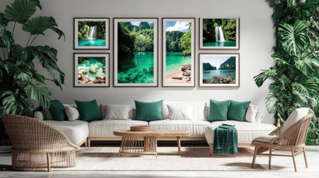 A beautifully designed living room featuring nature-inspired artwork and lush greenery, creating a tranquil ambiance perfect for relaxation and comfort.