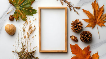 A stylish wooden frame surrounded by various autumn elements on a marble surface. Perfect for seasonal designs, warm themes, and creative projects.