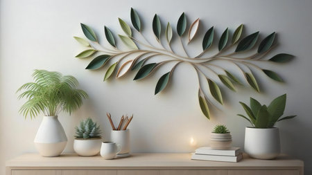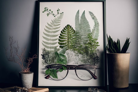 Botanical artwork showing detailed green leaves is elegantly displayed on a wooden shelf alongside decorative plants and jars, creating a serene ambiance.