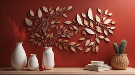 Vase with decorative leaves and books on wooden shelf near red wall. generative ai