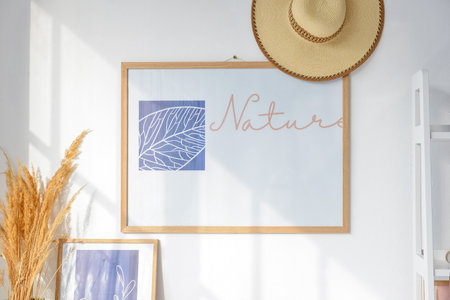 Stylish picture and hat hanging on light wall