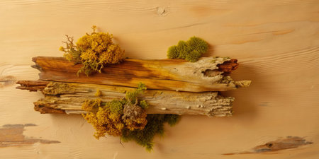 Dry wood with moss and lichen on the wooden background.