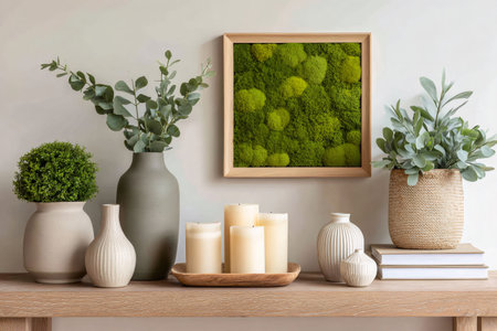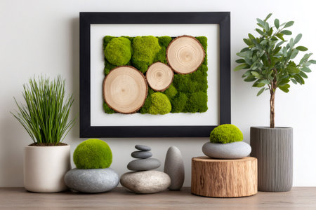 Stylish room decorated with framed moss art, potted plants, stacked rocks, and wood slices, creating a natural and relaxing atmosphere