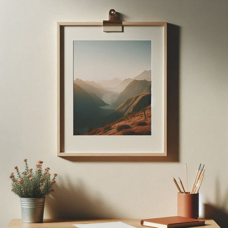 Photo frame on wood wall with mountain view and cactus in vase