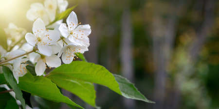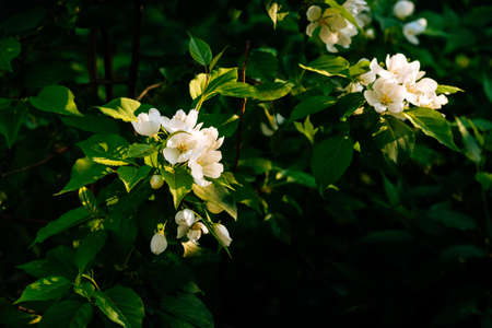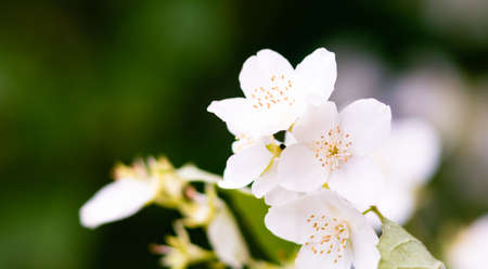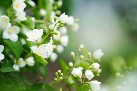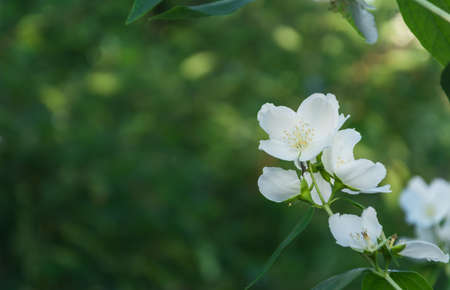 Beautiful branch of blossoming jasmine in a spring garden. Selective focus. Place for text.