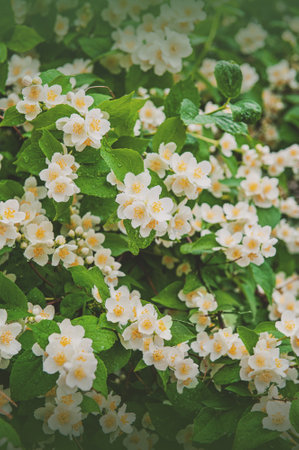 Jasmine bush flowers in garden during blossoming