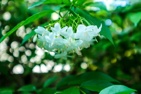 Beautiful white flowers on green leaves background on the tree branch
