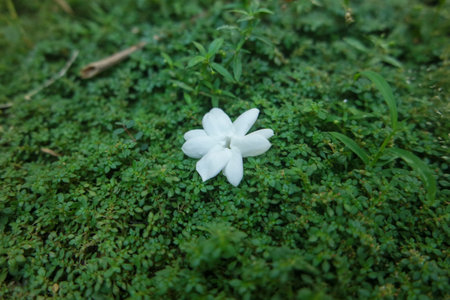 White jasmine flower on the green grass background. Nature.