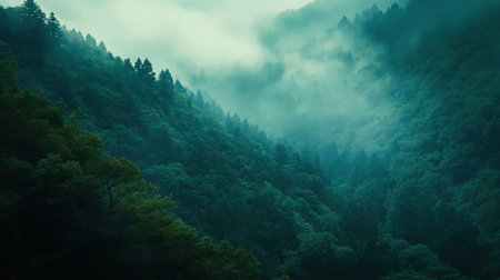 A captivating view of a dense forest enveloped in mist, showcasing the beauty of nature, tranquility, and exploration. The fog enhances the serene atmosphere.