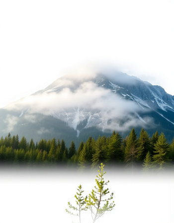 Forest of lush green pine trees in wilderness mountains rugged fading to white background