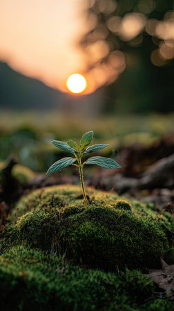 Photo of a young Potato growing on moss at sunrise, symbolizing hope and new beginnings.