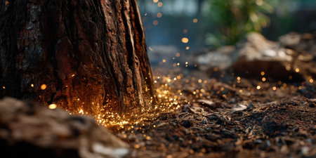 Tree bark with glowing fire sparks on forest ground creating warm natural atmosphere