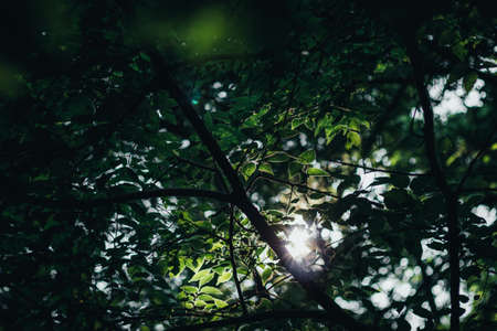 Sunset between the green leaves of some trees in the forest, natural background with sunflares.