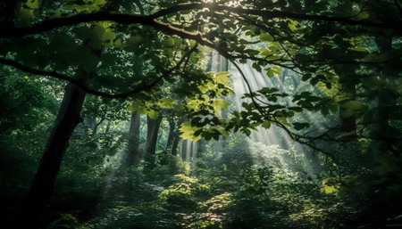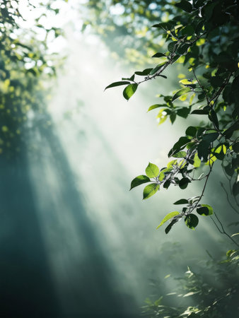 Bright sunlight beams filter through thick green foliage and branches in a misty forest creating an ethereal and serene natural atmosphere