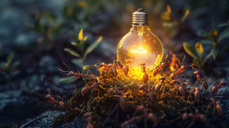 Ants clustered around a glowing light bulb, drawn to its warmth and brightness in the darkness.