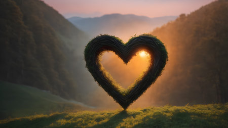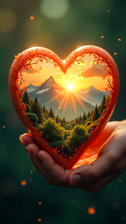 A glowing heart-shaped object reveals a breathtaking miniature landscape of mountains, trees, and a radiant sunrise. It is held tenderly in a person's hand against a soft.