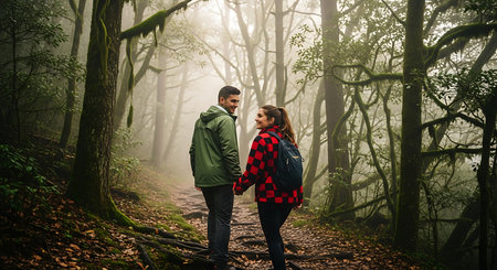 Young couple with backpacks on their backs smiling and walking in the forest, enjoy the walk.