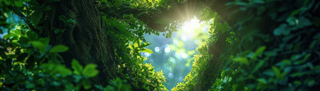 Sunlight Filtering Through the Lush Green Canopy of a Dense Forest Rays of light pierce through the verdant foliage creating a captivating and serene natural scene