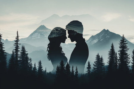 Double exposure silhouette of a couple in love overlaid with a forest and mountains. Romantic relationchips, nature and travel concept