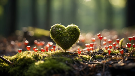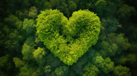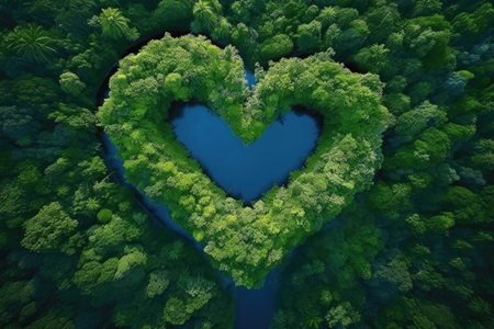 A natural heart-shaped opening in the lush green canopy of a forest, with sunlight streaming through, symbolizing love for the environment.