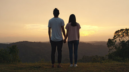 Young caucasian couple embracing at scenic mountain overlook during sunset. That the image is generated using AI.