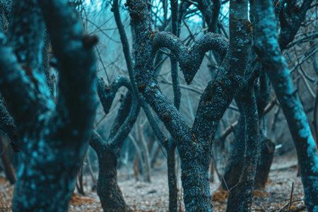 A dense forest filled with an abundance of trees covered in a thick layer of snow, A whimsical forest with trees shaped like hearts, AI Generated