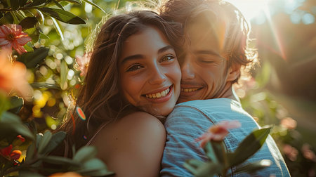 Young Happy Couple Embracing Outdoors in a Lush Garden at Sunset