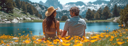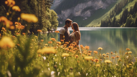 Couple enjoying scenic view serene lake nature photography peaceful environment romantic viewpoint connection to nature