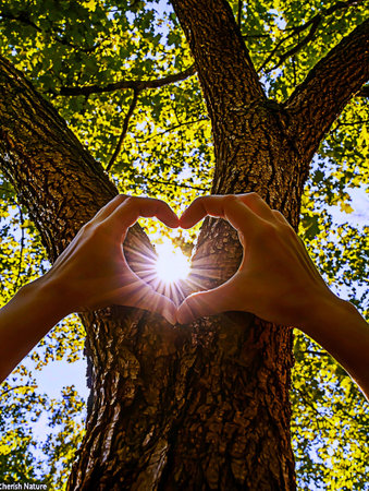 AI Generated - Two hands making a heart shape with the sun shining through the branches of a tree, surrounded by leaves and a clear blue sky. Professional stock photography for commercial use.