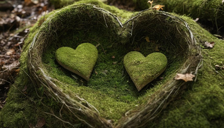 A heart-shaped cluster of vibrant green leaves rests on a sturdy branch, surrounded by rich foliage, symbolizing love and nature's beauty in harmony.