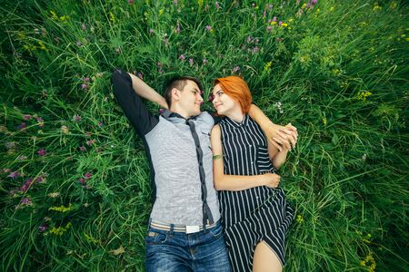 Young happy beautiful couple man and woman lying outdoors on the bright sunny day on green lawn